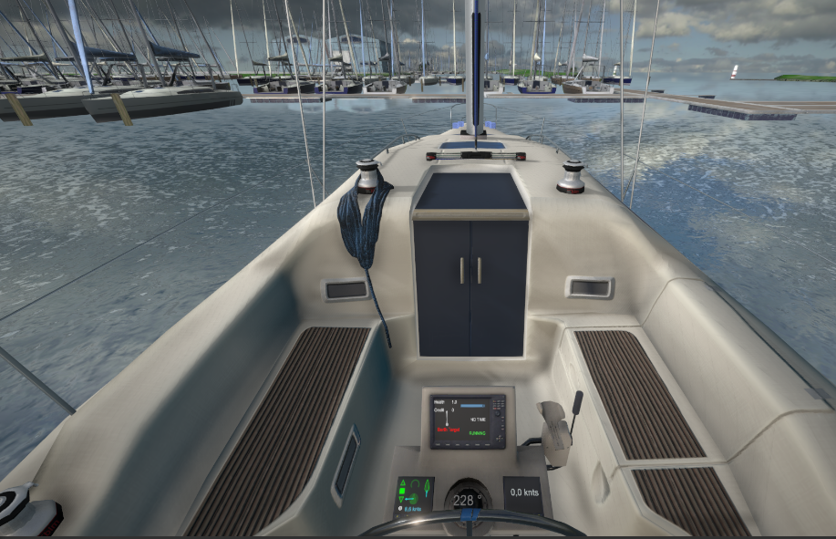 Die Entfernungsansage hilft dir (besonders beim Vorwärtsmanöver) Abstand und Restgeschwindigkeit einzuschätzen. Falls du das Schiff ohne Ruder verwendest, setze die Windgeschwindigkeit auf 0 und übe mit ALT 1 oder ALT 2. Ohne Ruder kannst du dich ganz auf den Schub konzentrieren.