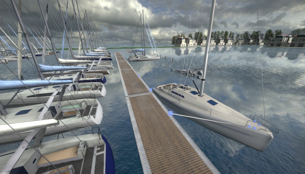 Am Steg kannst du frei mit verschiedenen Springs experimentieren. Untersuche die Auswirkungen von Schub und Ruderstellung auf die Bewegung des Schiffes. Schiebe dich vom Steg weg und versuche dich kontrolliert wieder anzunähern. Versuche auch ob du einen festen Abstand ein Zeit lang halten kannst.